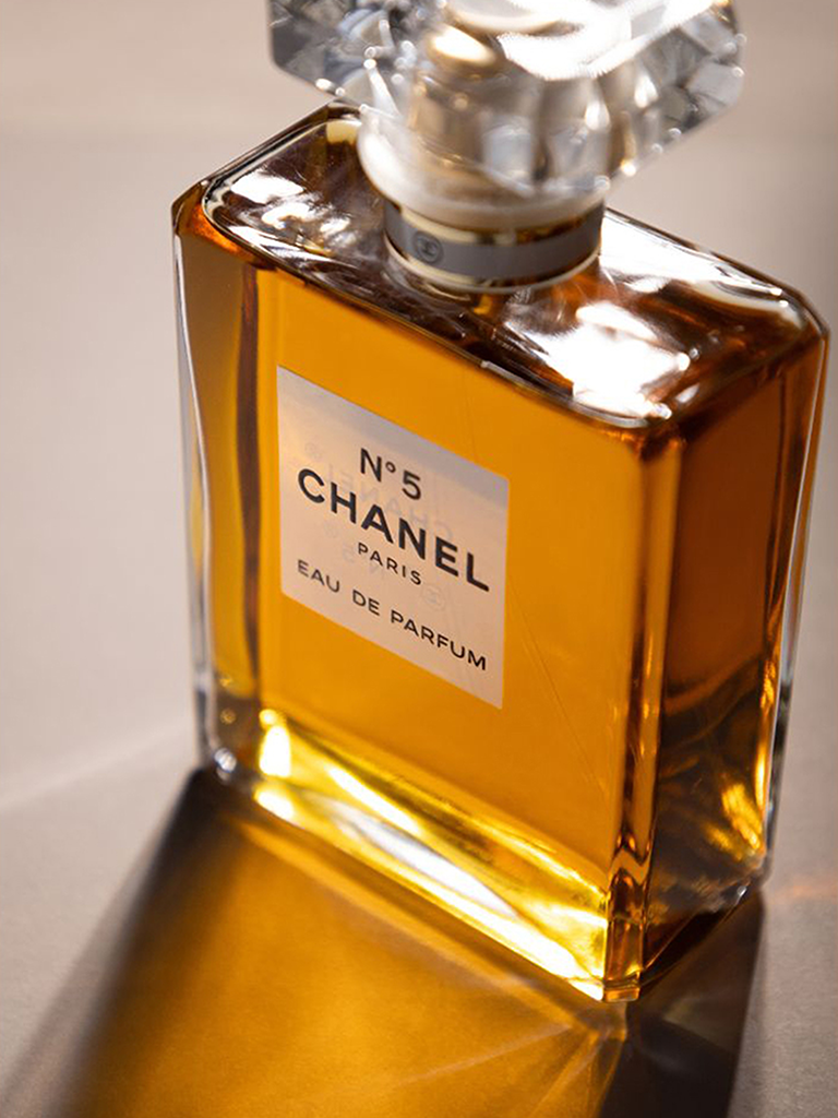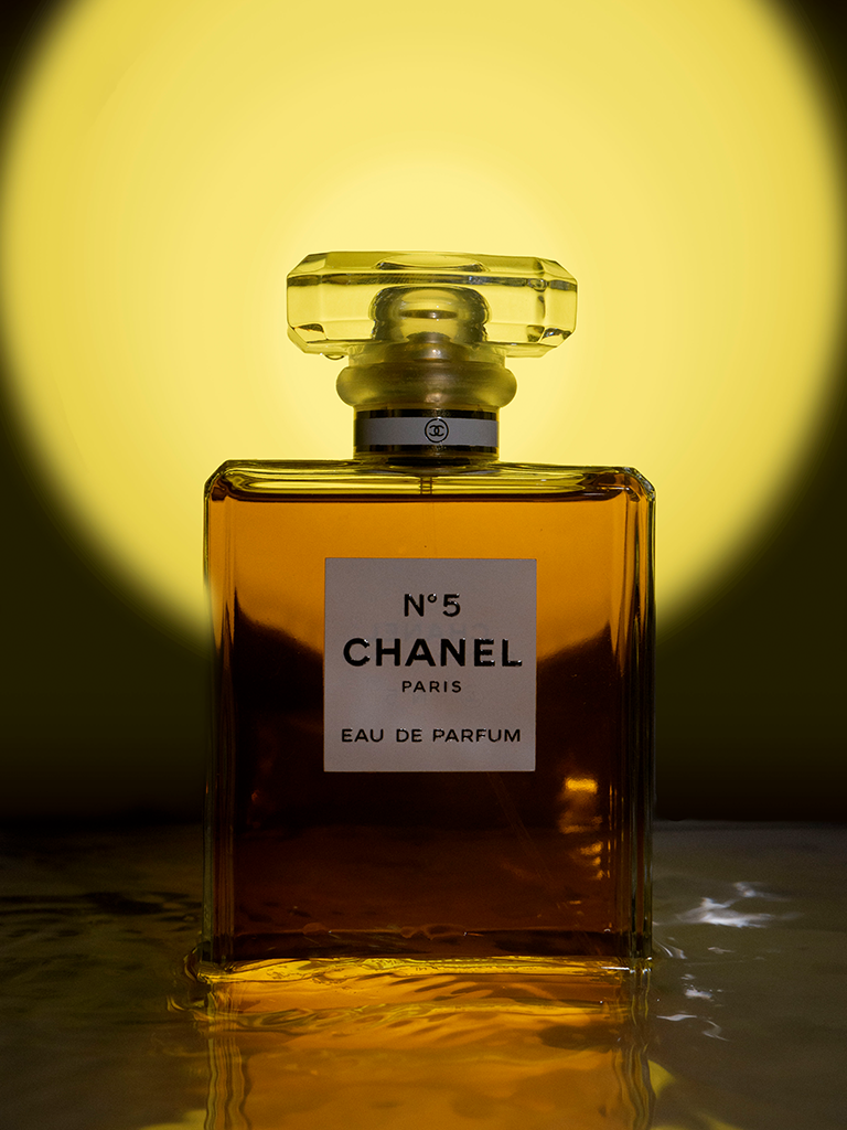 Chanel was selected for its elegance, featuring a simple water background to maintain focus on the product. Various lighting setups were employed with side top light highlighting the liquid color and shape, side light for reflections, top light for transparency, and backlight for contrast, ensuring a clear and captivating display of the product.