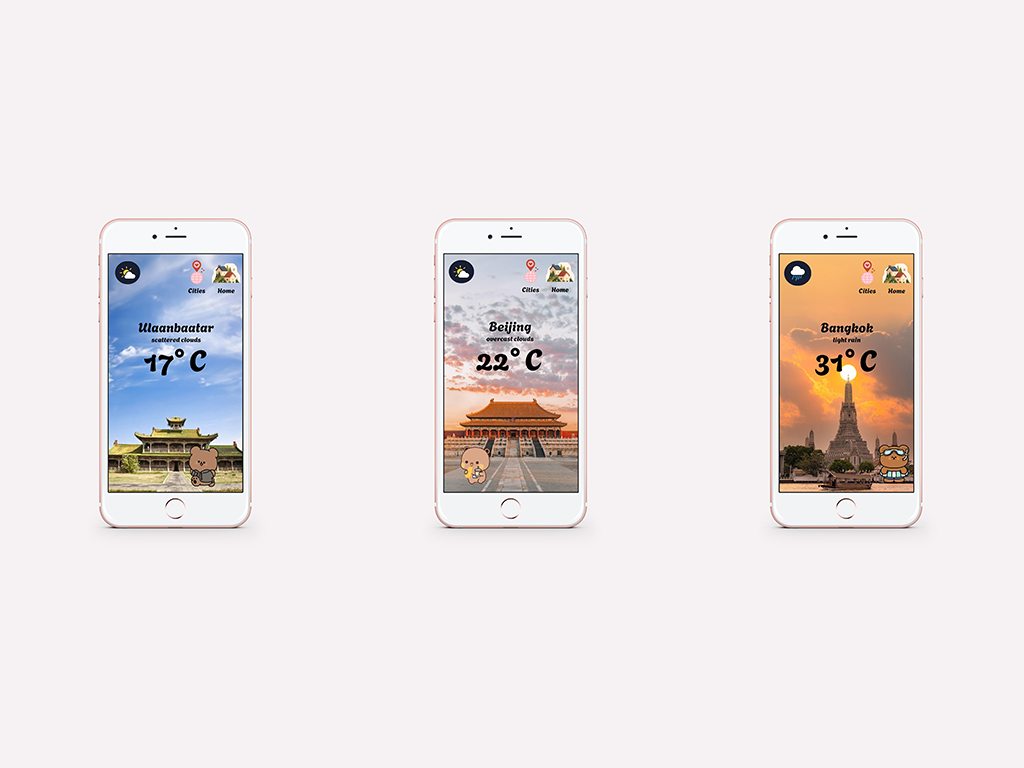 The theme of my weather web application is to make checking the weather fun and engaging. It features a cute little bear that appears throughout the app, adding a playful and friendly touch. The bear interacts with the user on every page, popping up with illustrations whenever a button is clicked. In the sky, a plane flies around, showing three major cities that is Bangkok, Beijing, and Ulaanbaatar. Users can click on any of these cities to get live weather updates. The design is meant to be cheerful and easy to use, making the experience enjoyable while providing useful weather information.